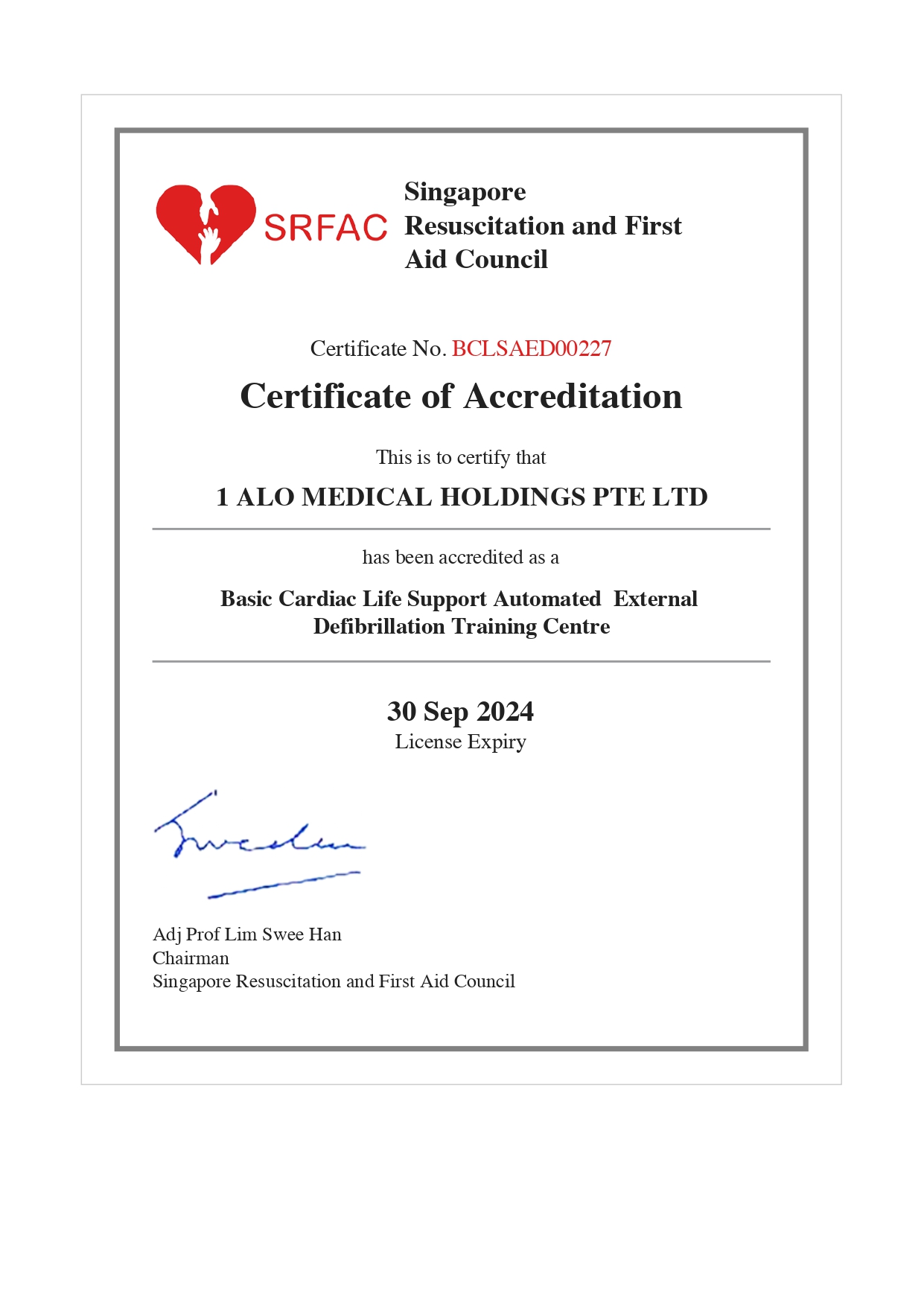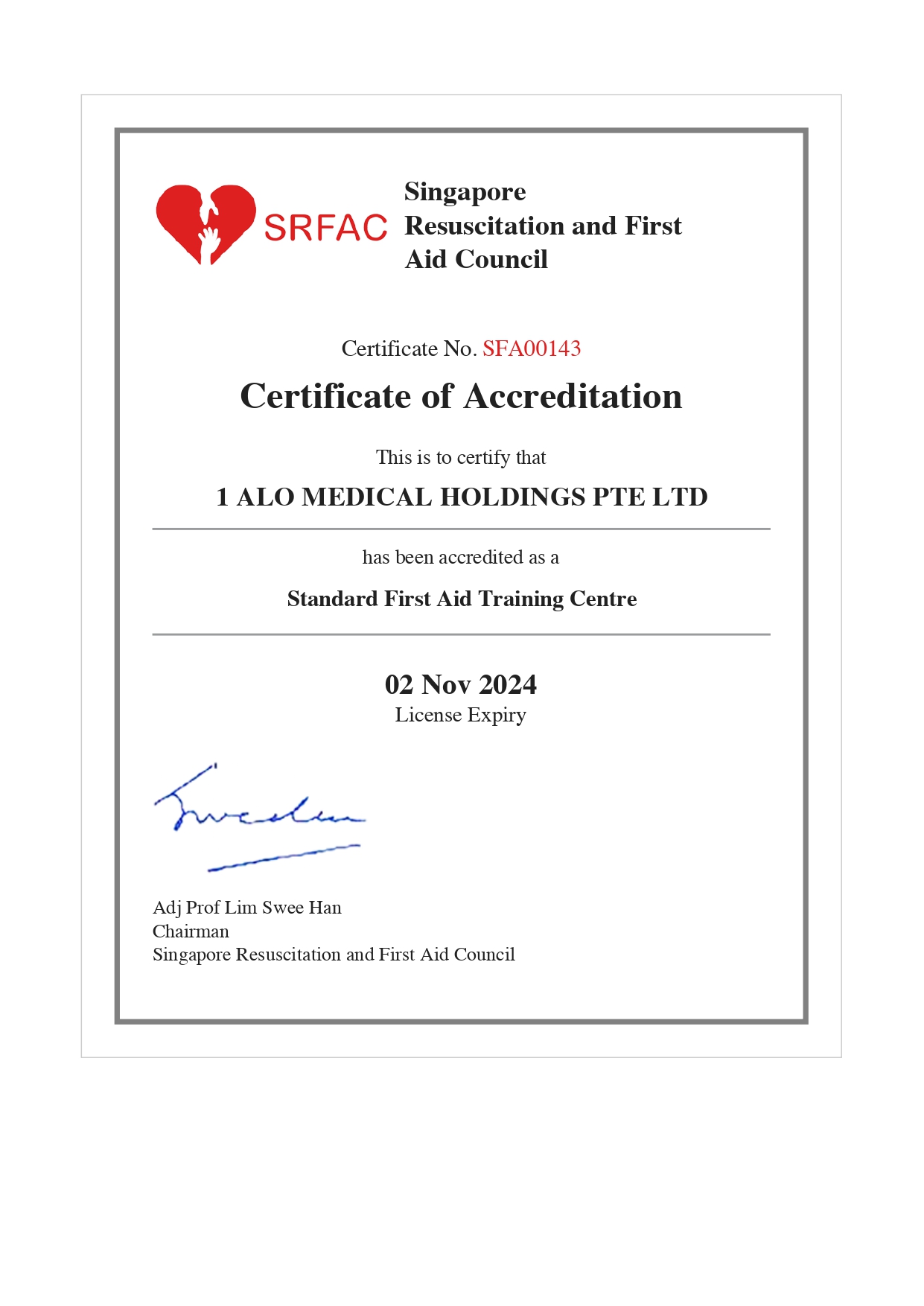 ALO proudly hold accreditation from the Singapore Resuscitation and First Aid Council authority, which sets the standards for resuscitation and first aid practices in Singapore.